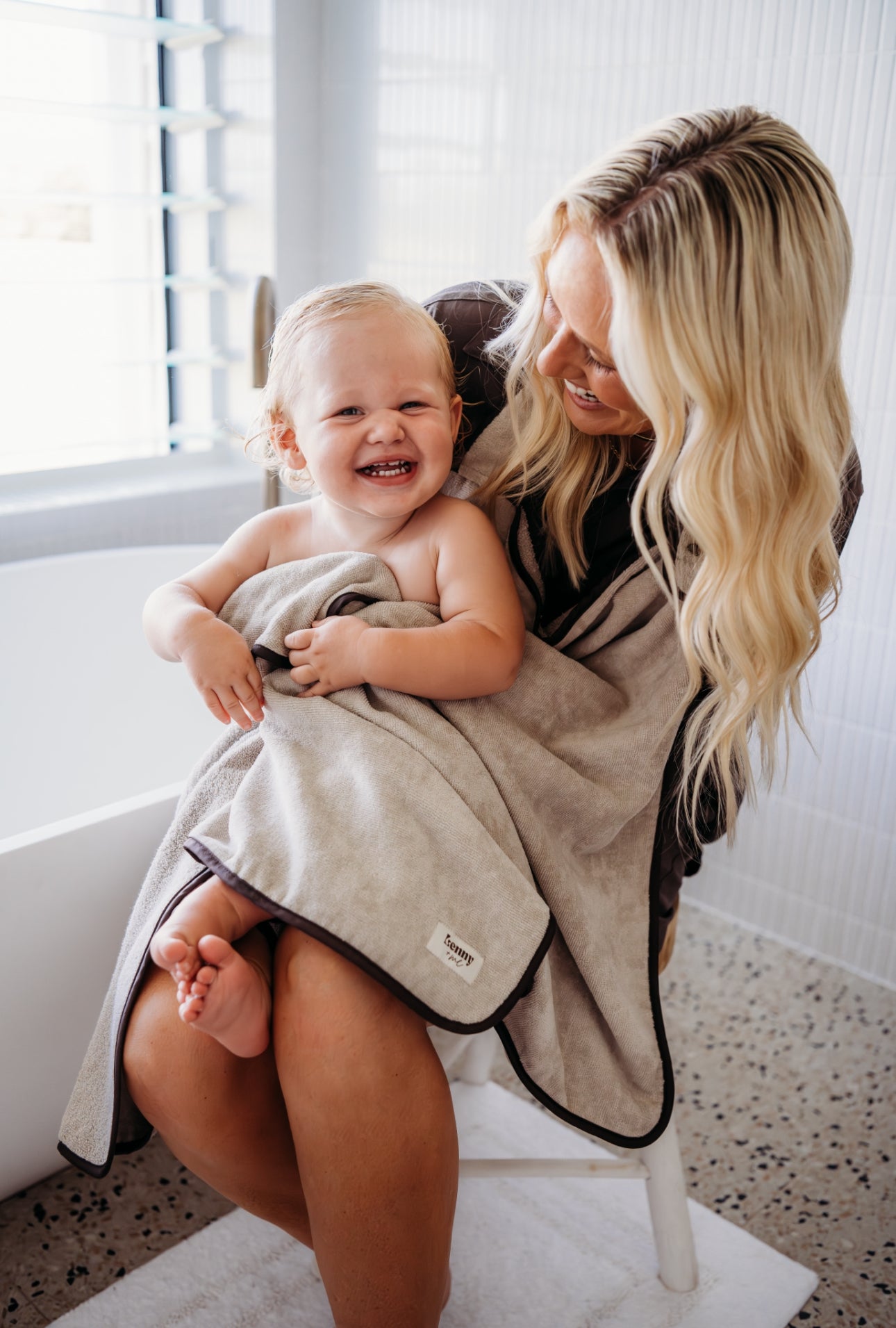 Our product features innovative design that combines functionality with modern aesthetic appeal. Our towel allows you to be hands free to focus on getting your precious ones out of the bath.